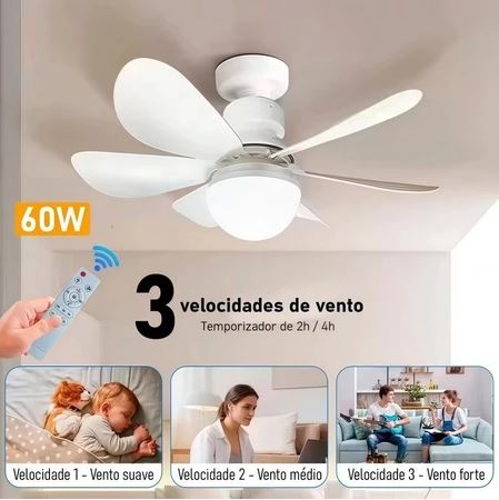 Ventilador de Teto com Lampada LED Integrada Bocal E27 6 Pétalas 60w 3 Velocidades C Controle Remoto